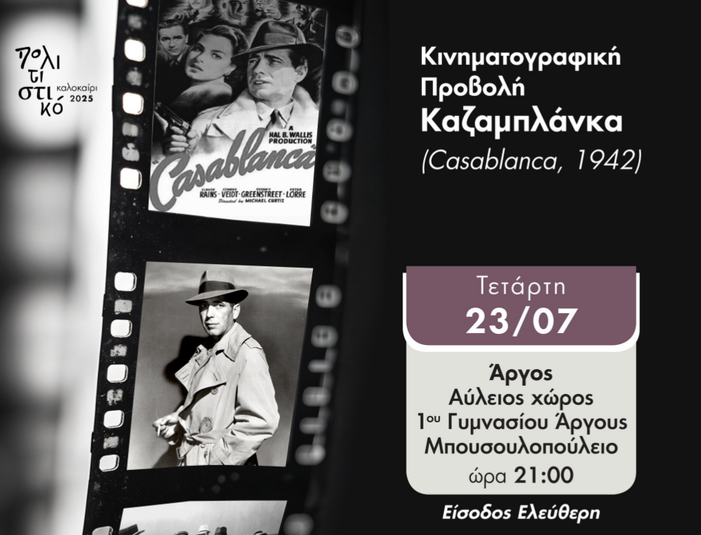 Πολιτιστικό Καλοκαίρι Άργους-Μυκηνών 2025: Σήμερα η προβολή της ταινίας “Καζαμπλάνκα”