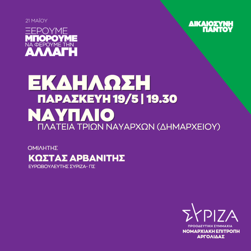 Η Νομαρχιακή Επιτροπή Αργολίδας ΣΥΡΙΖΑ – ΠΣ σας προσκαλεί σε ανοιχτή πολιτική εκδήλωση την,Παρασκευή19/5 και ώρα 19.30 στην Πλατεία Τριών Ναυάρχων (Δημαρχείου), στο Ναύπλιο Θα μιλήσει ο Κώστας Αρβανίτης, Ευρωβουλευτής ΣΥΡΙΖΑ- ΠΣ.Σας περιμένουμε όλες και όλους! Μαζί δίνουμε τη μάχη της 21ης Μάη για Δικαιοσύνη Παντού