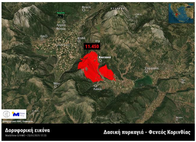 Μεγάλη αναζωπύρωση σημειώθηκε στο Μαυροβούνι Φενεού το μεσημέρι της Τετάρτης (23/07/2025), με το 112 να καλεί σε εκκένωση τρεις οικισμούς