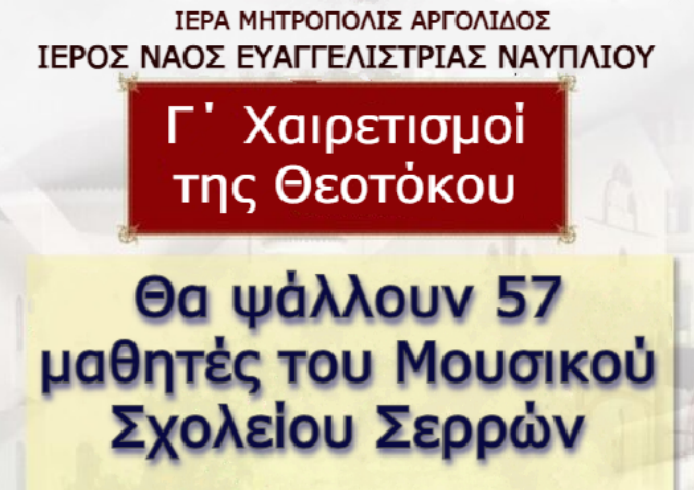 Μαθητές του Μουσικού Σχολείου Σερρών θα ψάλλουν στην Ακολουθία των Γ’ Χαιρετισμών της Θεοτόκου στην Ευαγγελίστρια Ναυπλίου